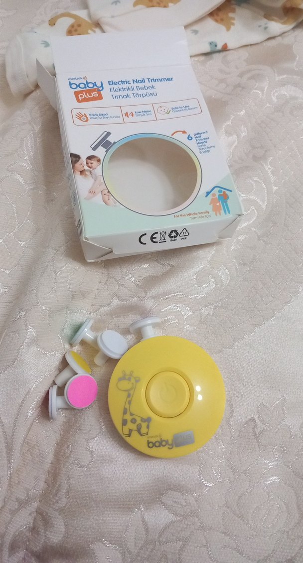 Sarı renkli elektrikli bebek tırnak kesici, 6 yumuşak zımpara başlığı ve sessiz motoru ile güvenli kullanım sunar. Aile için uygun.