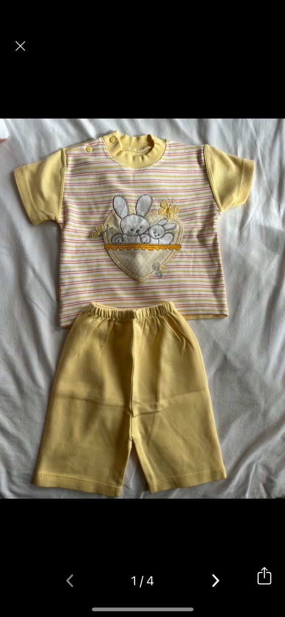 Pastel sarı kısa kollu, dantelli ve baskılı tavşan desenli tişört ile uyumlu sarı şorttan oluşan pamuklu bebek erkek takımı. 6-9 ay