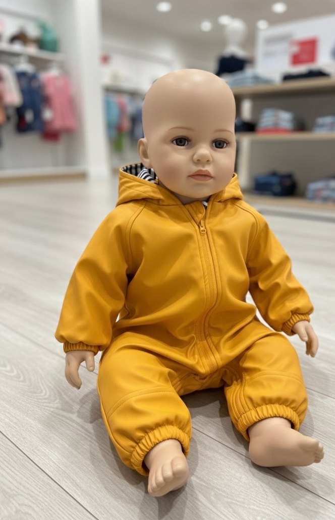 Parlak sarı renkli, fermuarlı, kapüşonlu ve desen içermeyen bebek erkek tulumu. Yumuşak ve sıcak kumaştan üretilmiştir.