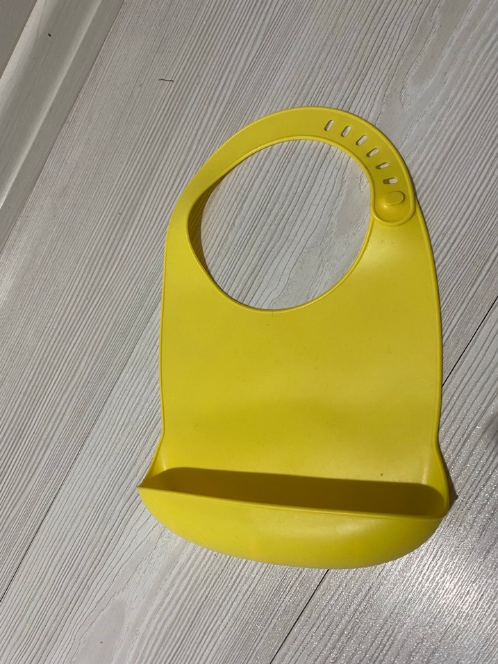 Ayarlanabilir boyun kısmı ve yiyecek tutma cepli, kolay temizlenen sarı bebek mama önlüğü. ️