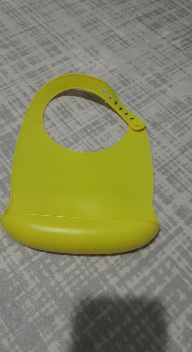 Ayarlanabilir boyun askısı ve yiyecek tutma cebi olan sarı bebek mama önlüğü, yumuşak ve kolay temizlenebilir malzemeden yapılmıştır.