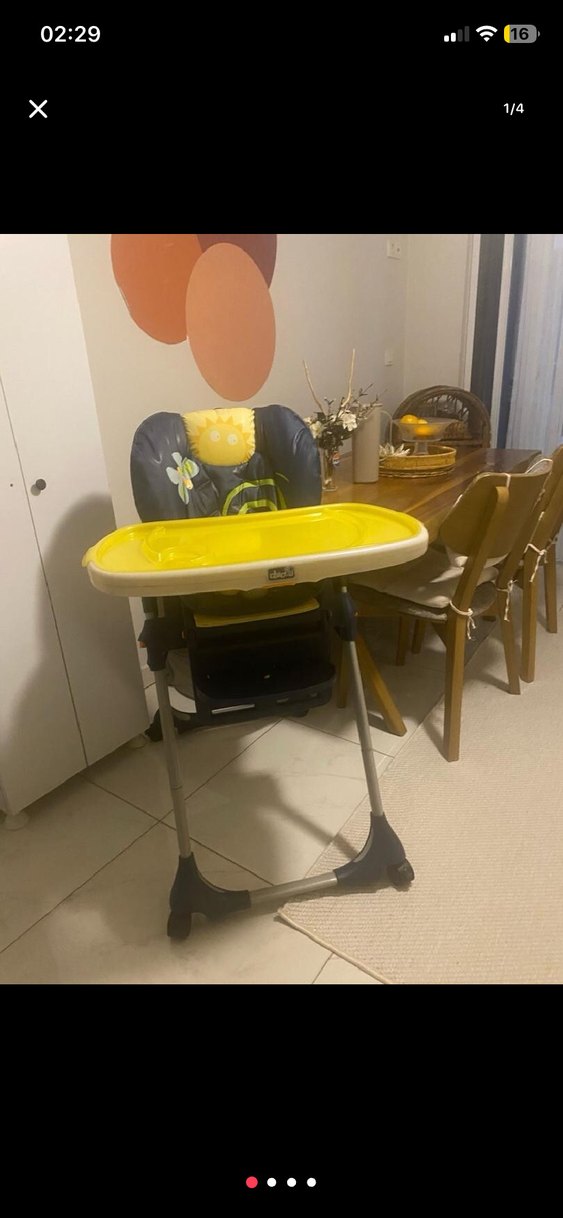 Chicco marka Koyu sarı renkte, geniş tepsili ve çiçek desenli yumuşak oturma yüzeyine sahip bebek mama sandalyesi.