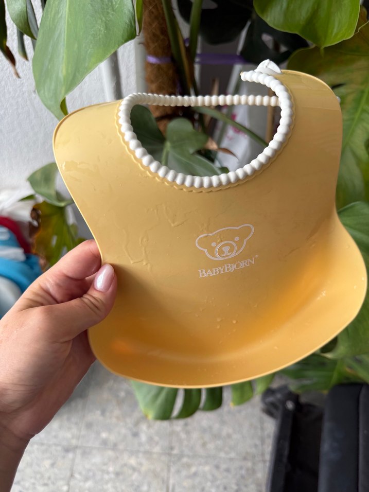 Pastel sarı renkte, baskılı ayıcık desenli bebek önlüğü. Kaydırmaz, esnek yaka kısmı ve döküntüleri yakalayan cep bulunur. Babybjörn marka