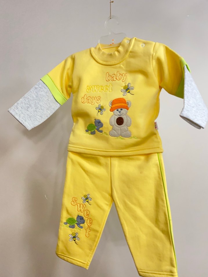 Renkli, örme sarı sweatshirt ve pantolondan oluşan bebek takımı. Uzun kollu ve yuvarlak yakalı, baskılı sevimli figürler ve 'baby sweet days' yazısı içerir. Rahat ve yumuşak kumaşlıdır. 1 yaş