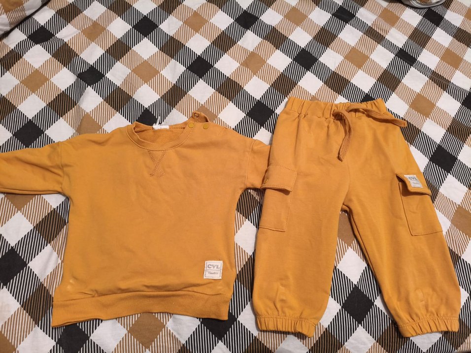 Koyu sarı uzun kollu bebek takımı, yuvarlak yaka ve yumuşak, sıcak kumaştan, rahat ve şık street wear tarzında. 6-9 aylık 3 kez kullanıldı