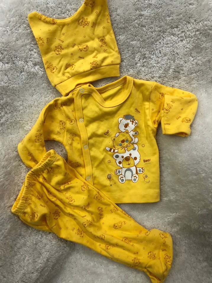 Sarı renkli, uzun kollu, bisiklet yaka bebek takımı. Renkli baskılı ve örme dokulu, yumuşak ve sıcak kumaştan üretilmiştir.
