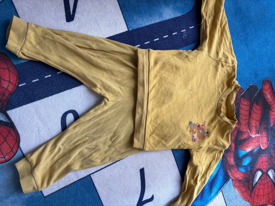 Uzun kollu, bisiklet yaka ve düğmeli detaylı sarı bebek takımı, yumuşak ve sıcak kumaştan üretilmiştir. 2 yaş diyor ama bir yaşa daha uygun..ufak belli belirsiz lekeleri vardır