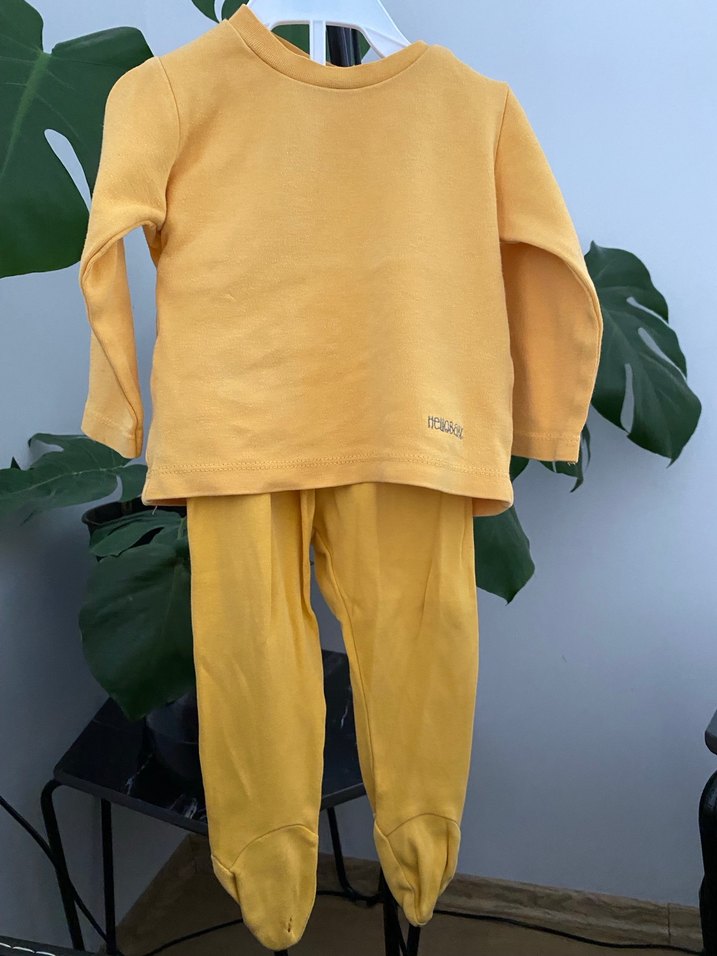Pastel sarı renkte, uzun kollu ve yuvarlak yakalı, yumuşak ve sıcak kumaştan yapılmış rahat sokak stili bebek takımı.