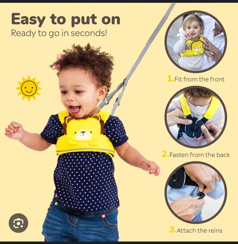 Renkli sarı bebek yürüteci askısı, kolay giyilip ayarlanabilir. Çocukların güvenli ve rahat yürümesini sağlar. Hızlı kullanım için basit toka sistemi bulunur.
