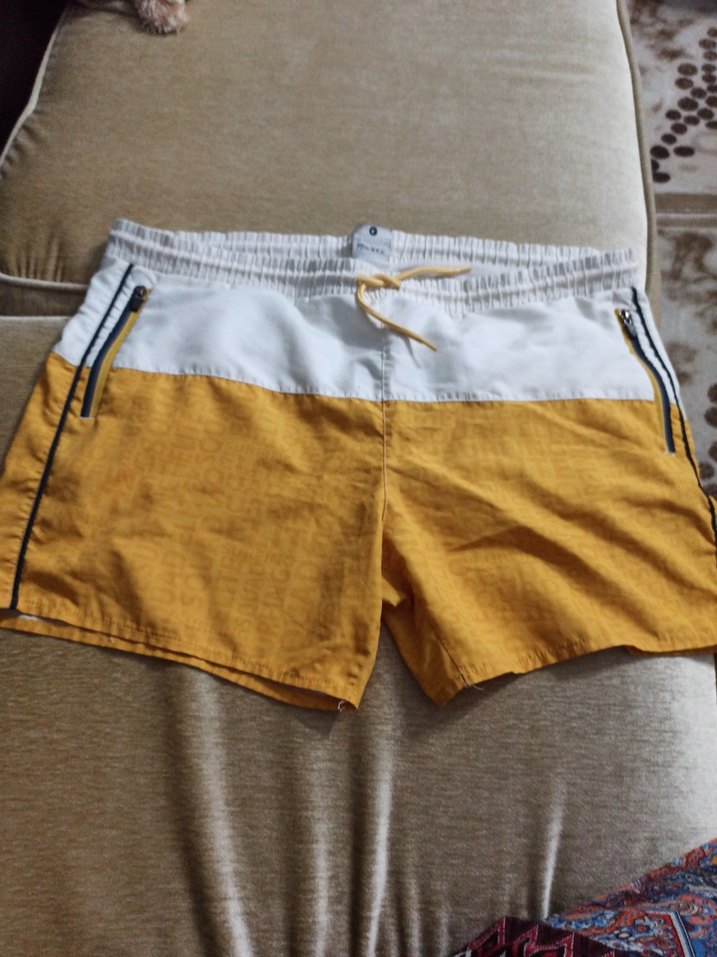 Sarı renkli, bel detaylı, bol kesim erkek Deniz şortu. Önünde fermuarlı cepler bulunur, plaj ve günlük kullanım için uygundur.