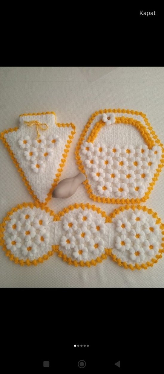 Sarı ve beyaz renklerde çiçek desenli, el örgüsü üç dekoratif parça içeren set. Ev dekorasyonuna sıcaklık katar.