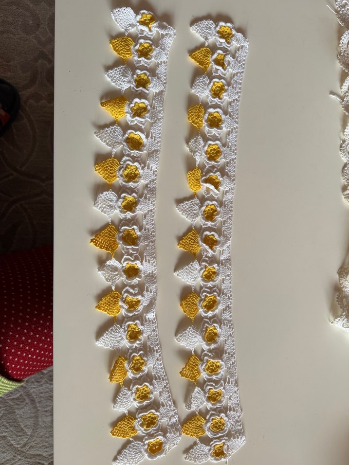 El yapımı örgü dantel şerit, sarı ve beyaz çiçek ile yaprak desenleriyle bohem tarzda el işidir. Ürün sıfırdır.