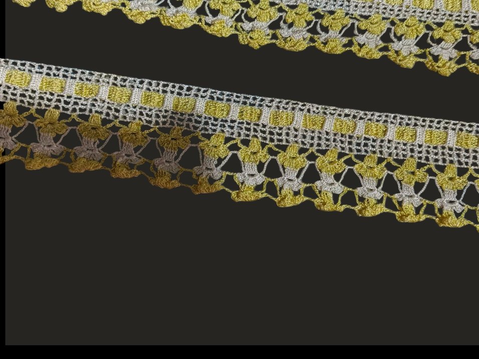 Sarı ve beyaz renklerde, bohem tarzda el örgüsü dantel kenar, ince ve detaylı desenlere sahiptir.