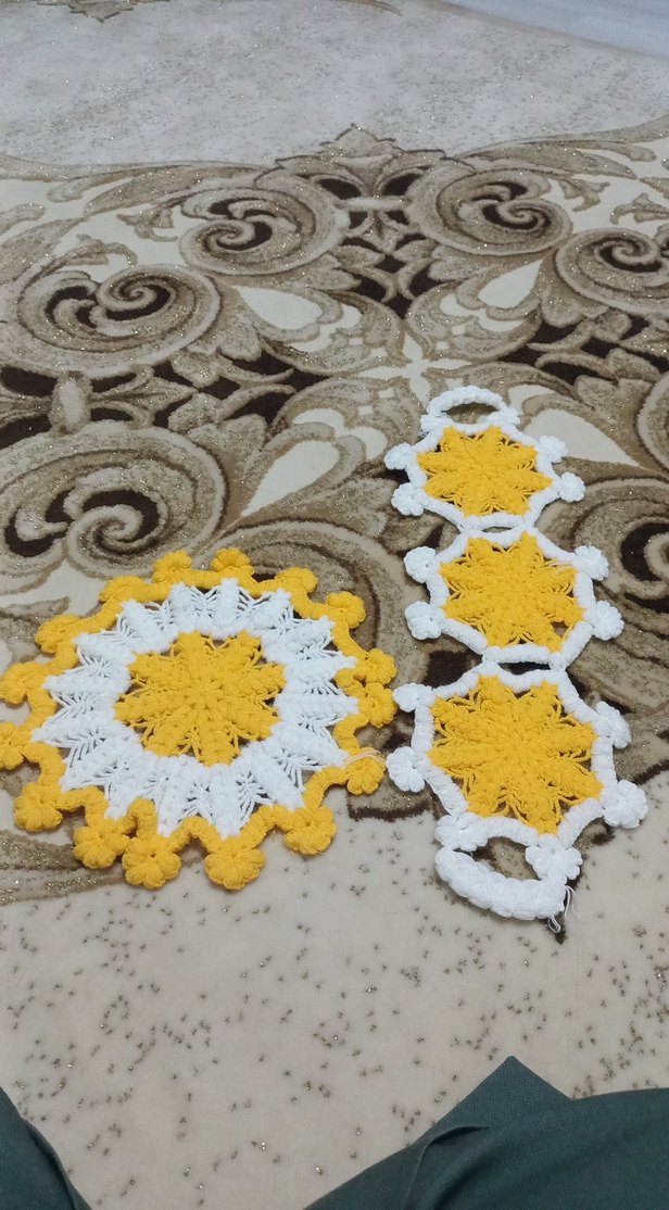 Sarı ve beyaz renkte, yuvarlak ve altıgen şekilli el yapımı örgü dekorasyon seti. Geleneksel tekniklerle hazırlanmıştır. 2 li fiyatıdır 4 lü değil
