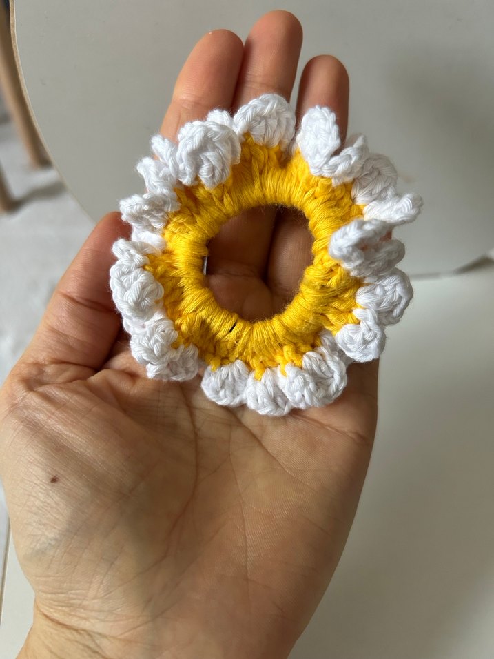 Toplu sipariş alınır Sarı ve beyaz renklerde, fırfırlı örgü yapıya sahip, bohem ve minimalist tarzı bir araya getiren renkli saç tokası.