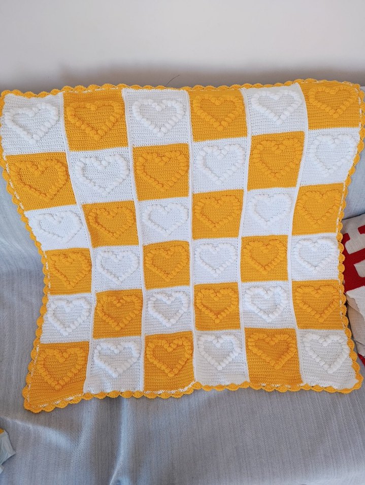 Renkli örgü çocuk battaniyesi, sarı ve beyaz kareli desenli, kalp motifleriyle süslenmiştir. elimde hazır almak isteyene kargo yapılır