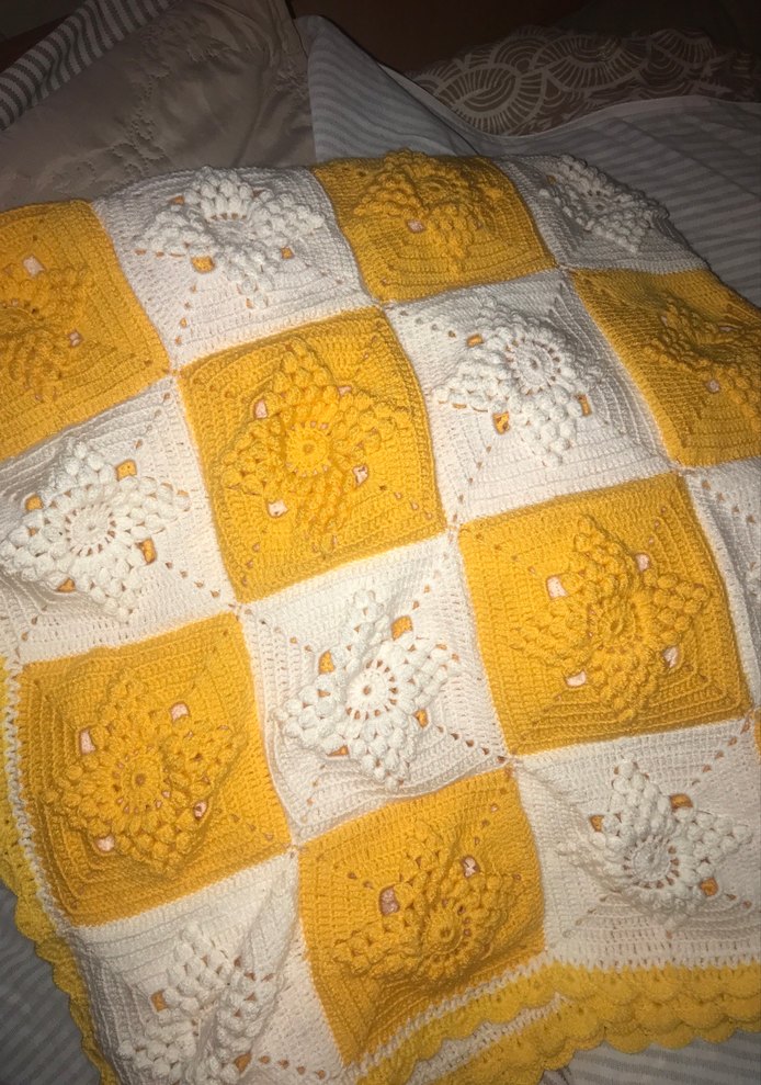 Bu bebek battaniyesi, sarı ve beyaz karelerden oluşan örgü dokusuyla yumuşak ve rahat bir his sunar.