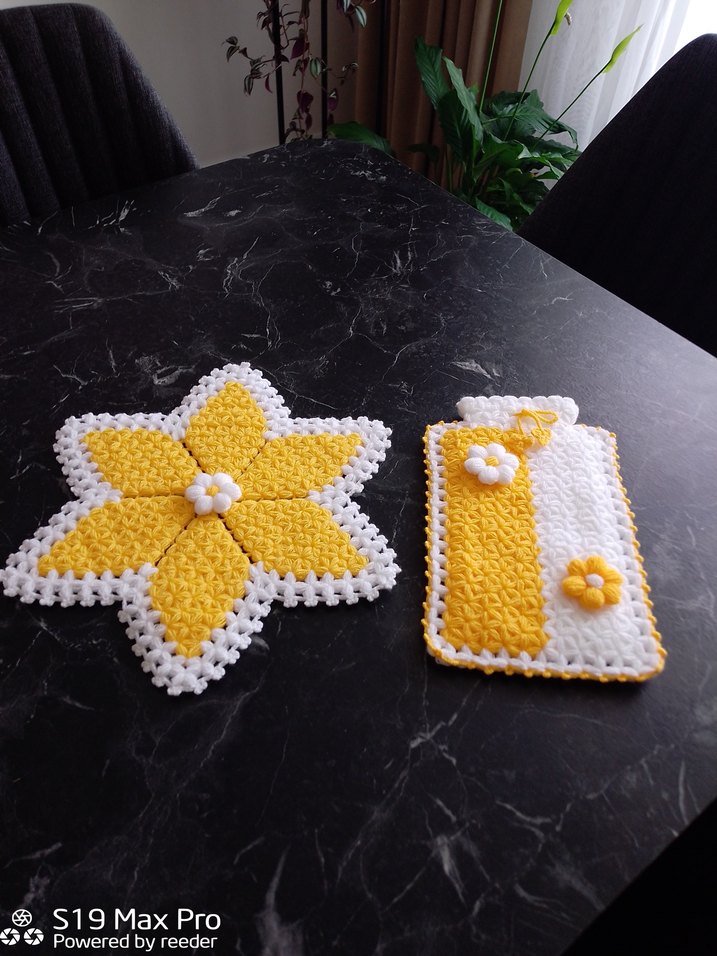 Sarı Beyaz Örgü Çiçekli Dekoratif Set