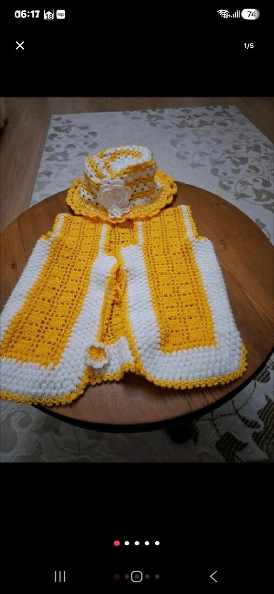 Sarı Beyaz Örgü Kız Yelek ve Şapka Takımı