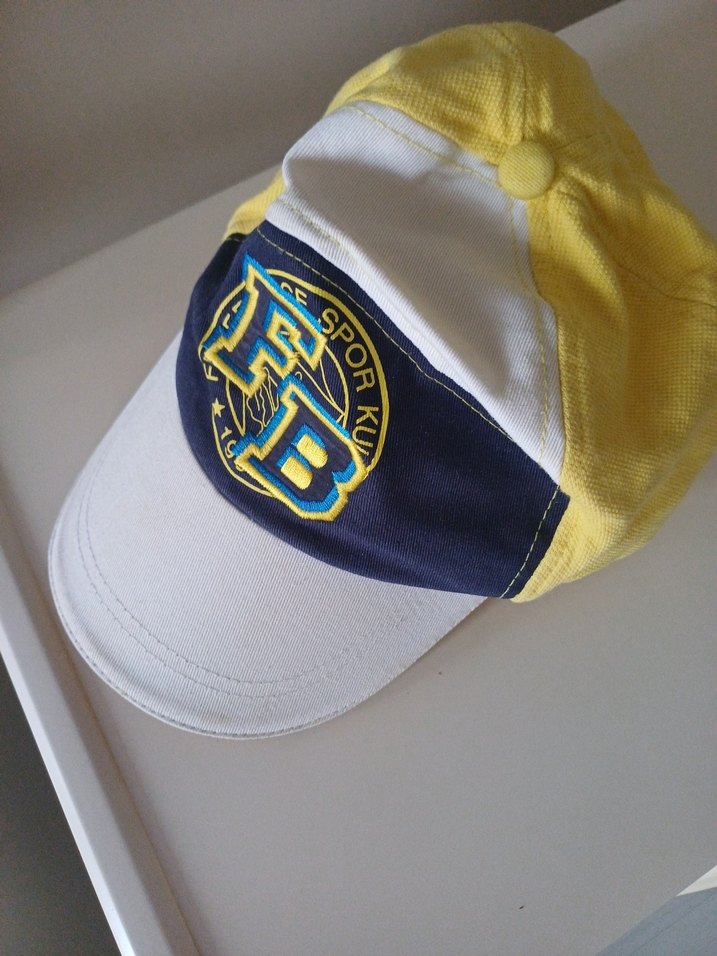 Erkekler için sarı ve beyaz renklerin kullanıldığı, ön kısmında lacivert ve sportif bir amblem bulunan şapka. Trendy ve rahat tarzlar için uygundur.