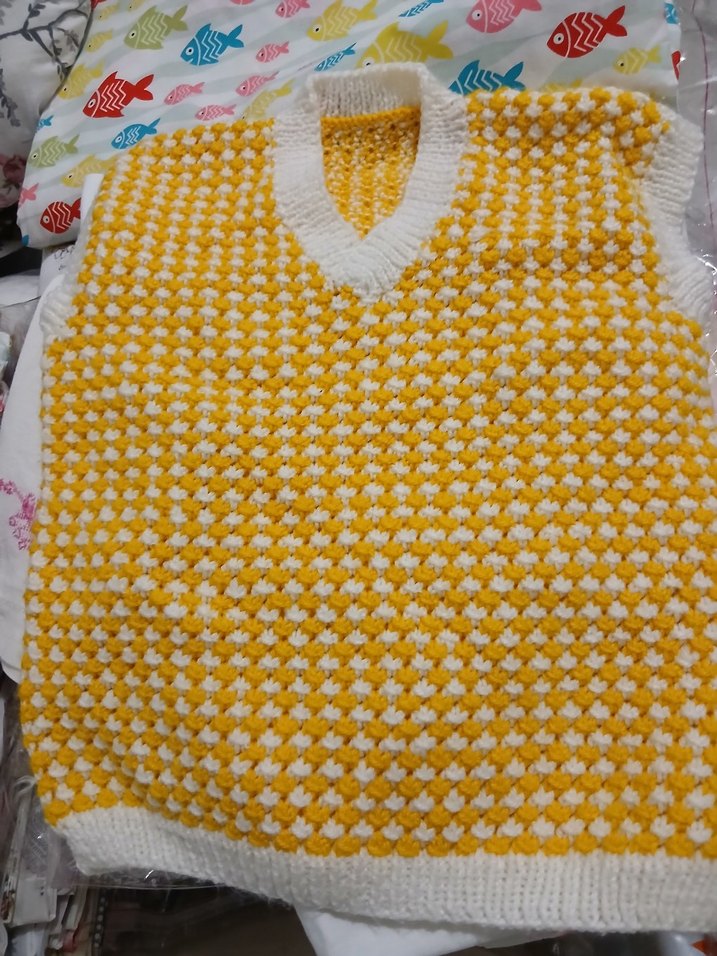 Sarı ve beyaz renklerde, V yakalı, örgü dokulu, kız çocukları için rahat kesimli kolsuz süveter. Street wear tarzına uygun renkli bir parça. el örgüsü