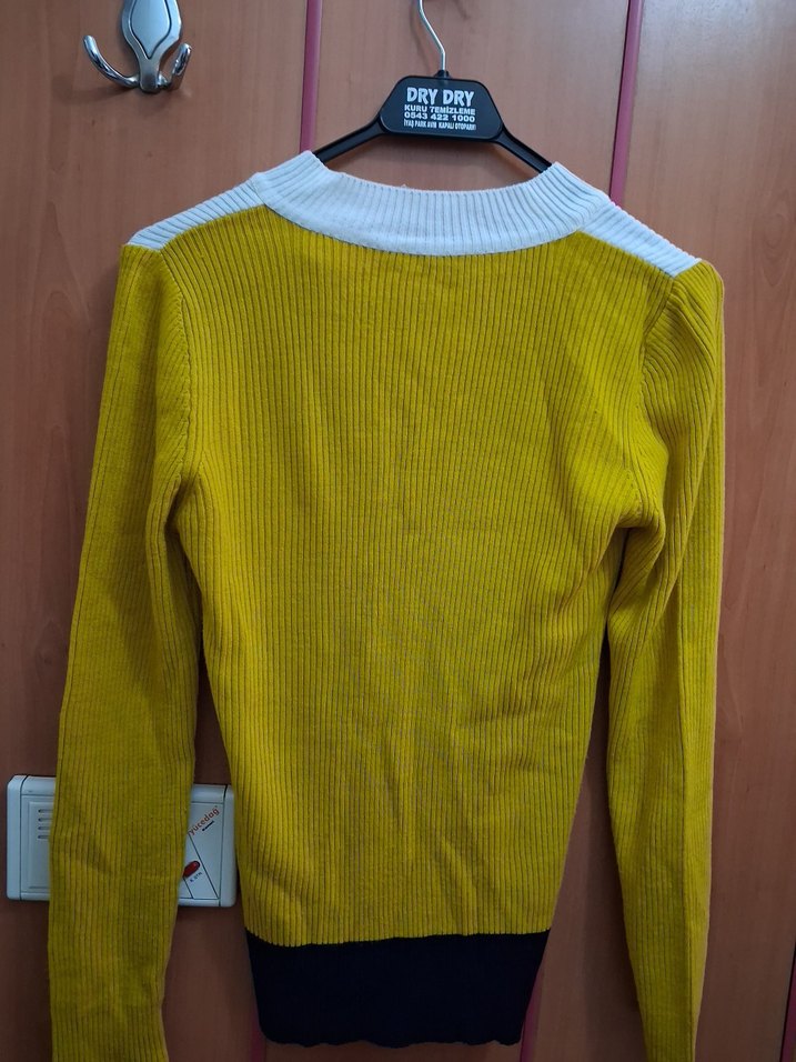 Sarı renkli, beyaz yuvarlak yakalı, uzun kollu, triko dokuma kadın kazak. Normal uzunlukta ve desensiz. Marka: DRYDRY.