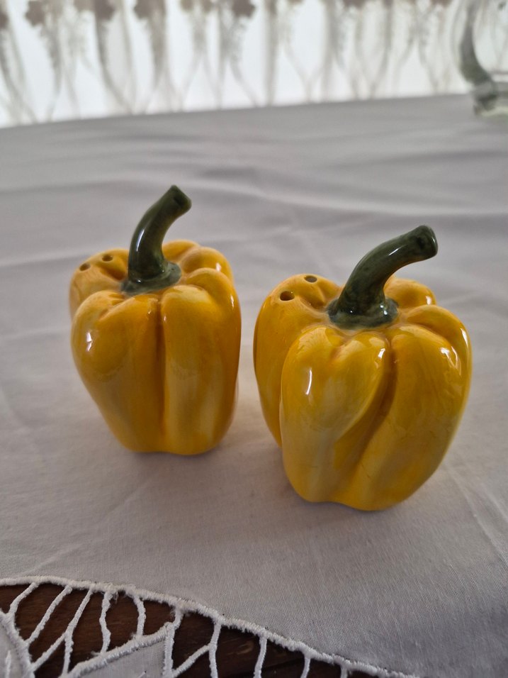 Canlı sarı renkte, biber şeklinde tuzluk ve biberlik seti, mutfağınıza neşeli bir dokunuş katıyor.