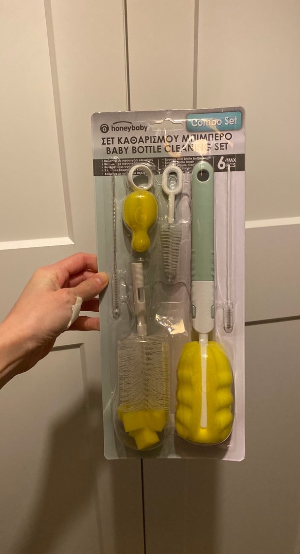 Altı parçadan oluşan biberon temizleme seti, sarı ve açık yeşil saplı fırçalar içerir. Bebek biberonlarını hijyenik tutmaya yardımcı olur. Yunanistan’dan alınmıştır. Hiç açılmadı.