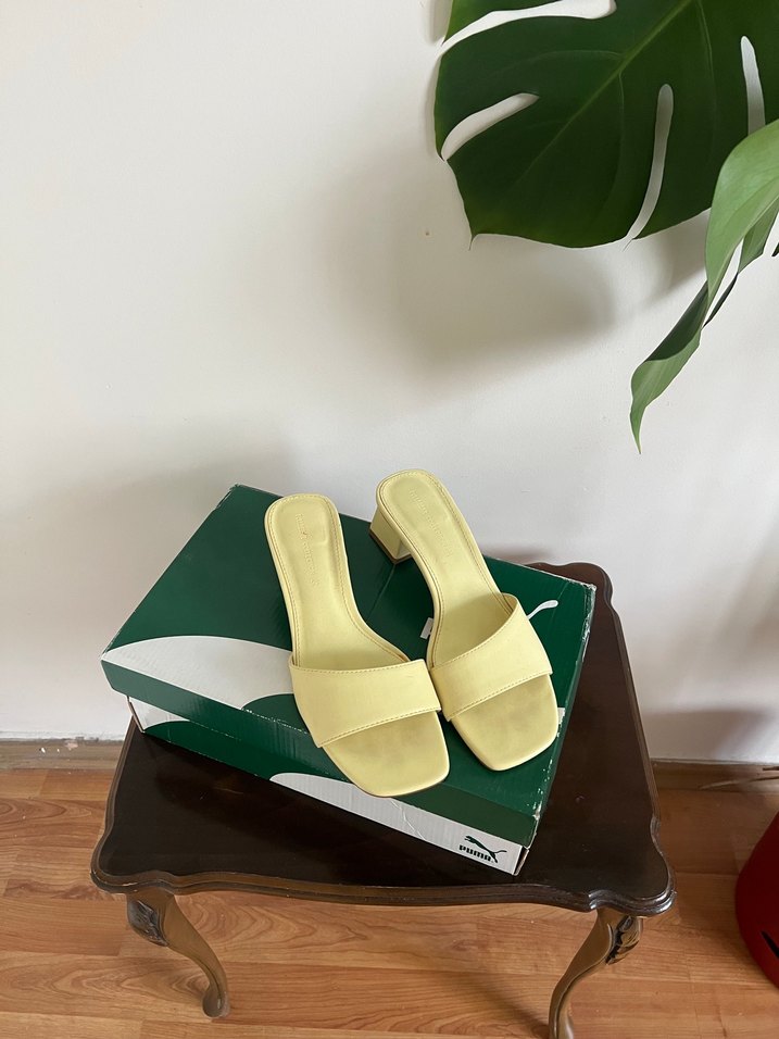 Kirli sarı renkte, blok topuklu kadın terlik. 36 Pull&Bear.