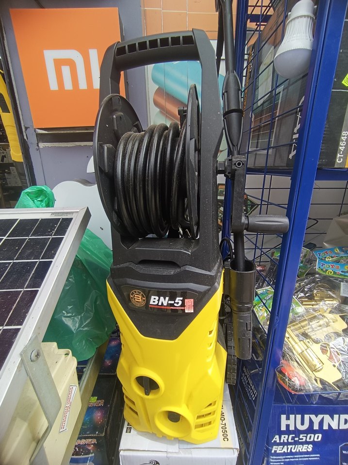 Hortum makarası bulunan sarı BN-5 basınçlı yıkama makinesi, kolay taşınabilirlik ve etkili temizlik sunar.