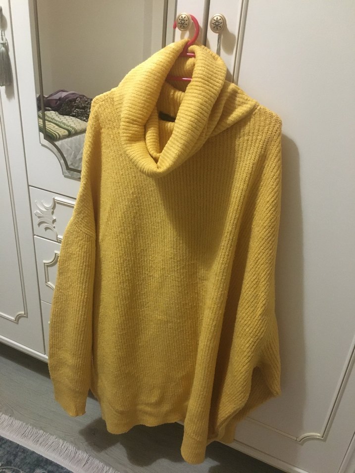 Sarı renkli boğazlı kazak, uzun kollu ve bol kesimdir. Normal midi boyunda, yumuşak örgü kumaştan yapılmıştır, rahat ve günlük kullanıma uygundur.
