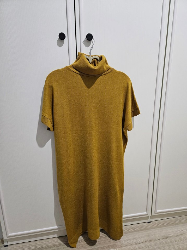 Sarı renkli yün triko elbise, boğazlı ve kısa kollu. Rahat kesimi ve midi boyu ile günlük rahat stil sağlar. tunik olarak giyilebilir. Sadece 1 kez giyildi. icine uzun kollu body giydigim icin tene temas etmedi.