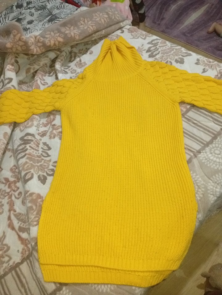 Fitted kesim, sarı örgü kazak, boğazlı yaka ve dokulu uzun kollu yapısıyla günlük rahat ve konforlu bir stil sunar. ben elbisee olarakda giydim kısa giyenlere fikir olsun