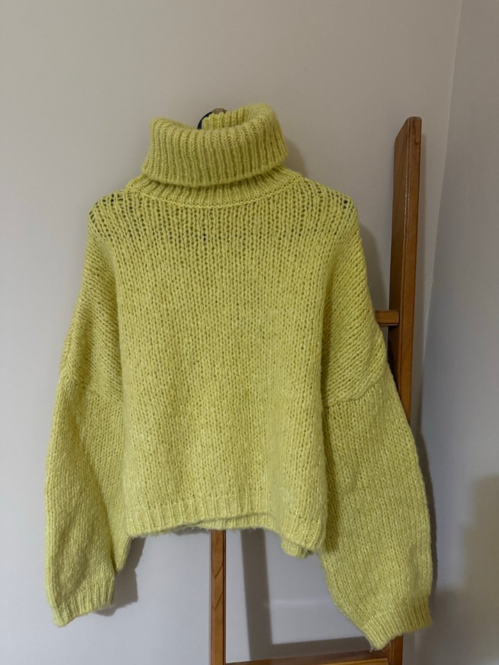 Sarı renkli, boğazlı ve uzun kollu örgü kadın kazak, rahat ve bol kesimdir. Günlük kullanıma uygun sade ve yumuşak dokulu bir parçadır.