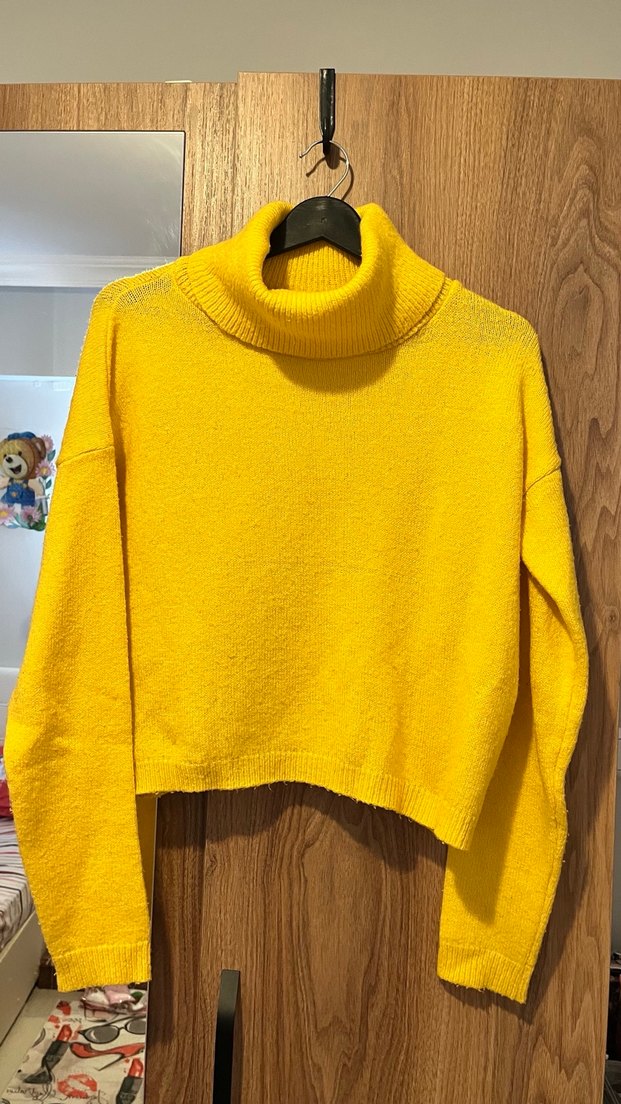 Sarı örgü kazak, boğazlı yakalı ve uzun kolludur. Rahat, bol kesimi ve parlak görünümüyle günlük sokak tarzına uygundur.