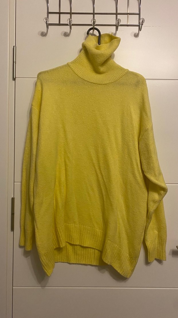 Kadınlar için pastel sarı renkte, bol kesim ve uzun kollu, boğazlı triko kazak. Yumuşak yün dokusu ve midi boyuyla rahat ve sıcak tutar.