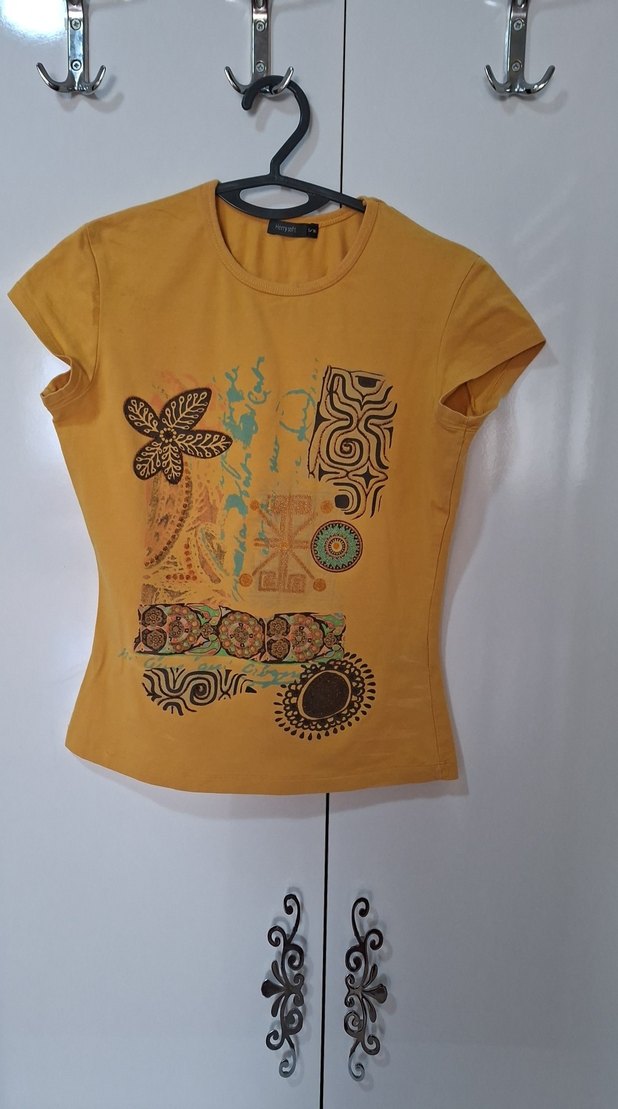 Kısa kollu, yuvarlak yaka, sarı renkli, bohem baskılı, tekstil kumaştan, normal boyda, dar kesim hamile tişörtü.