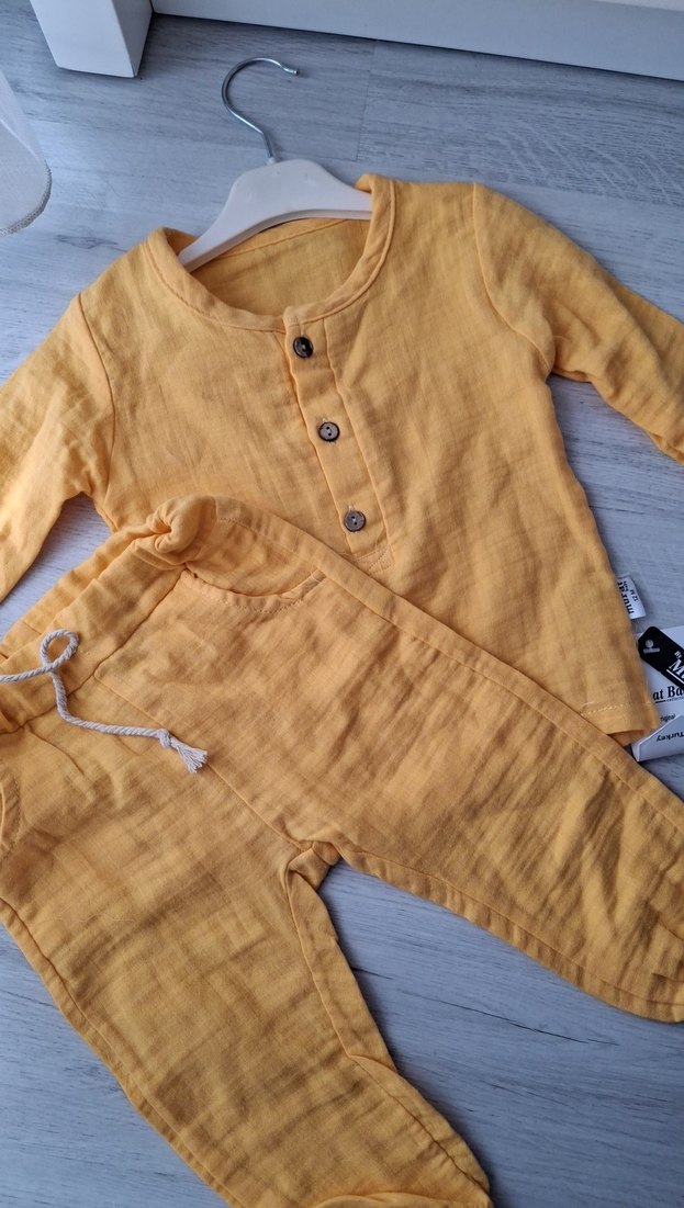 Sarı renkli, keten kumaştan yapılmış bebek takımı. Uzun kollu, yuvarlak yaka ve düğmeli detaylara sahip, bohem tarzda ve pastel tonlarda.