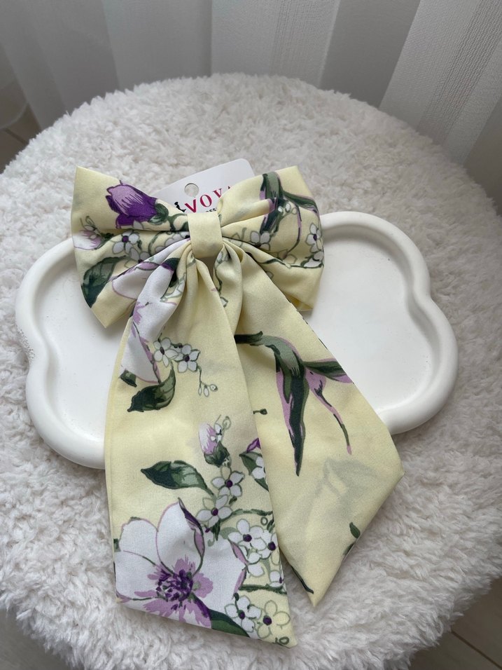 Pastel sarı renkte, çiçek desenli sentetik kumaştan bohem tarzda fiyonk saç tokası. Retro ve hippie stillere uygundur.