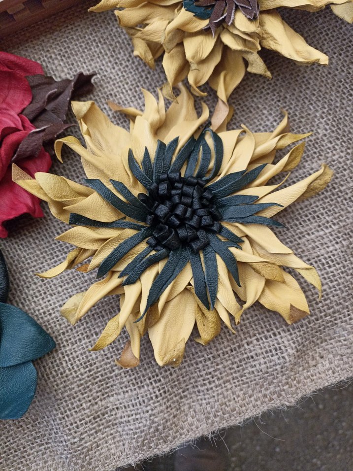 Koyu sarı renkte, fırfırlı yapraklı, bohem tarzda çiçekli broş. Vintage ve hippie görünümler için düğünlerde kullanılabilir. Elde üretilmiştir.