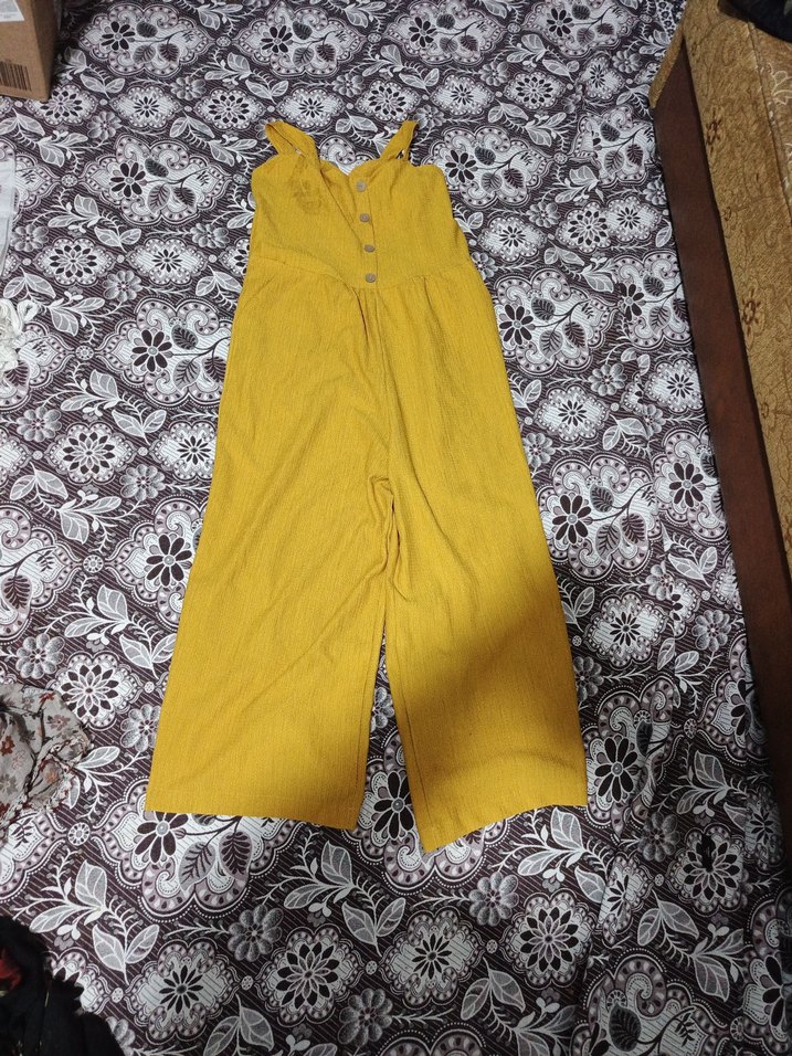 Sarı uzun tulum, düğmeli önü, straplez yakası ve bol kesimiyle rahat bir bohem tarz sunar. Sentetik kumaştan, günlük kullanım için uygundur. Kollarsız tasarım konfor sağlar