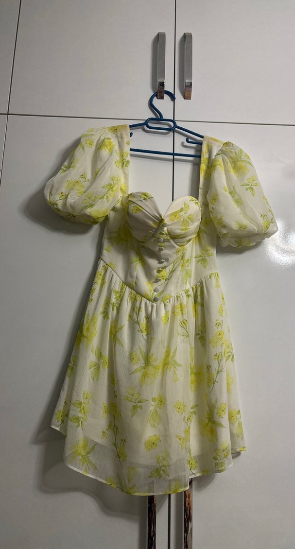 Askılı kolları ve düğme detayları olan, bol kesim, askısız midi elbise. Hafif sarı tonlarında tie-dye deseniyle vintage ve bohem tarzı yansıtıyor.