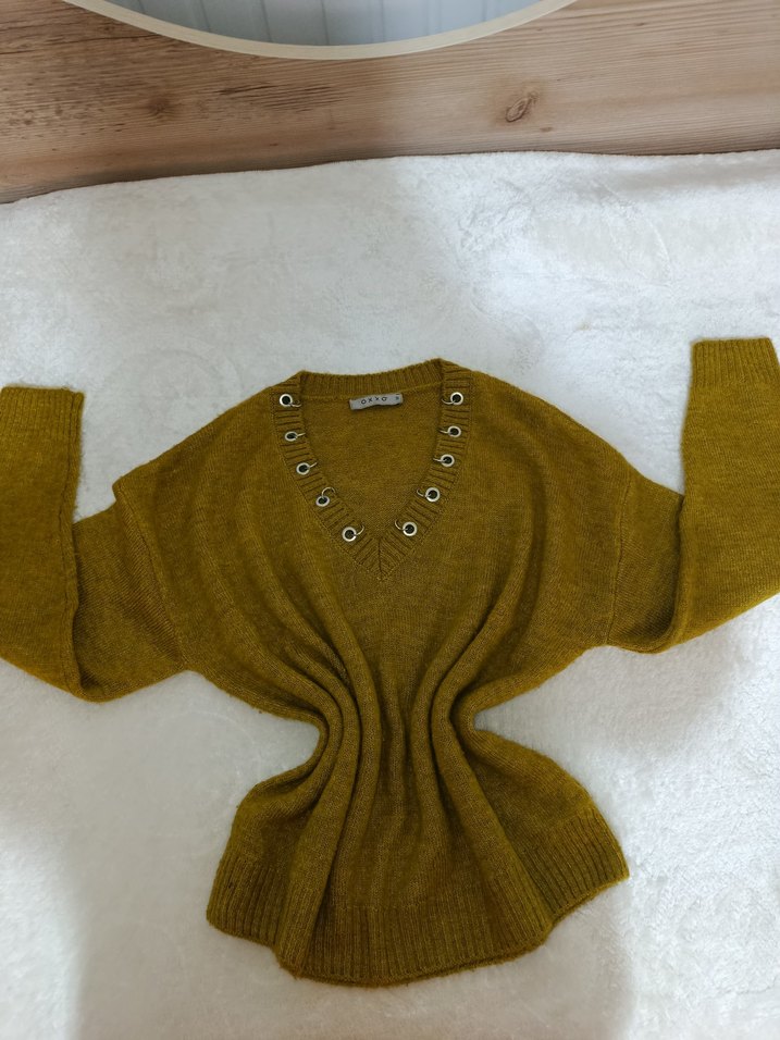 Metal halka detaylı V yaka, uzun kollu, bol kesim sarı triko kazak. Parlak ve desensiz, rahat günlük kullanıma uygun.