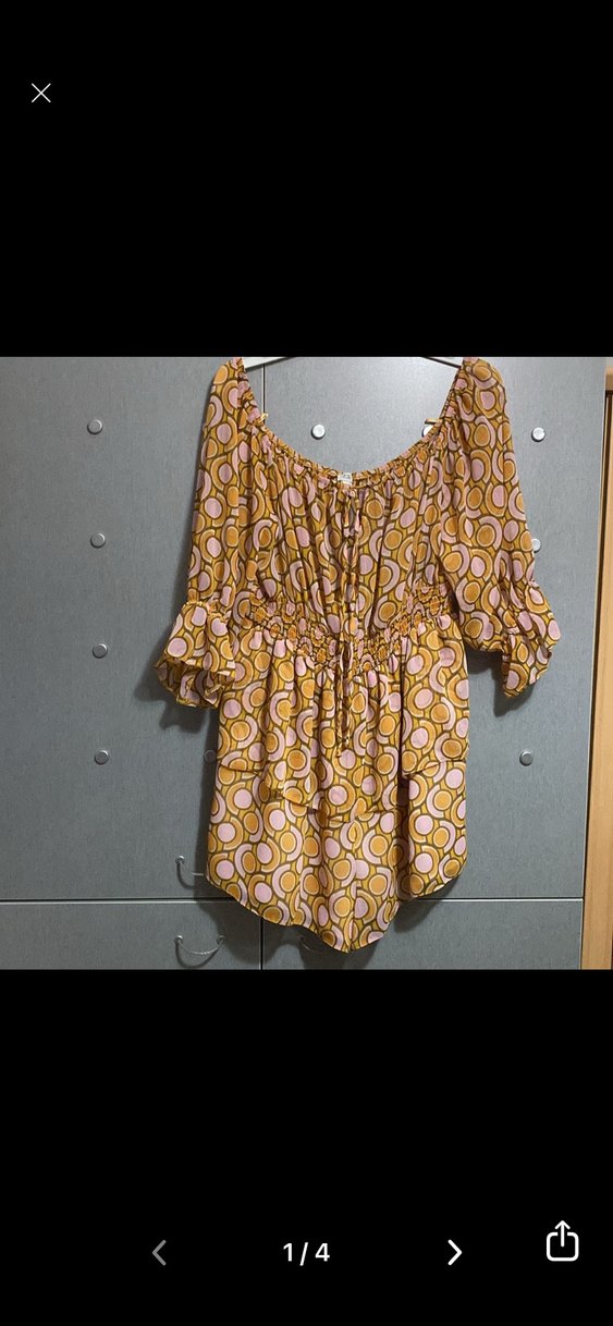 Sarı renkte, bağcıklı ve fırfırlı detaylara sahip, kısa kollu, salaş kesim bohem bluz. Sentetik kumaştan, bağlama ipi ve bağlama detayı bulunur.