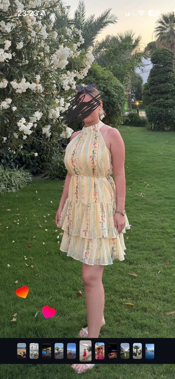 Bu sarı bohem midi elbise, halter yaka ve fırfırlı katmanlara sahiptir. Yumuşak sentetik kumaştan yapılmış olup, pastel tonlarda batik desenlidir, parti için uygundur.