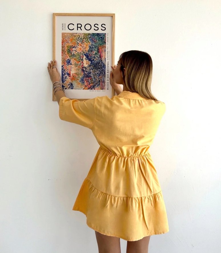 Yumuşak keten kumaştan, V yaka ve uzun kollu sarı bohem mini elbise. Bol kesim, fırfır detaylı ve baskılı desene sahiptir. Günlük kullanıma uygundur.S M L