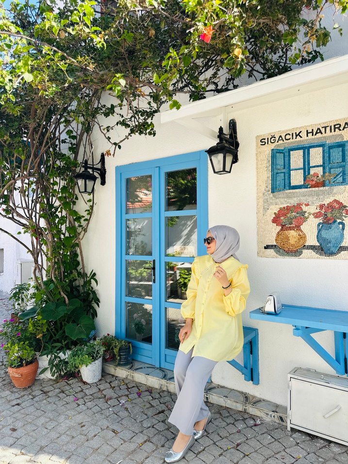 Sarı bohem tarzda mini tunik, bol kesim, kısa kollu ve balıkçı yaka. Pamuklu, etnik desenli ve transparan detaylı, günlük tesettür için uygun.