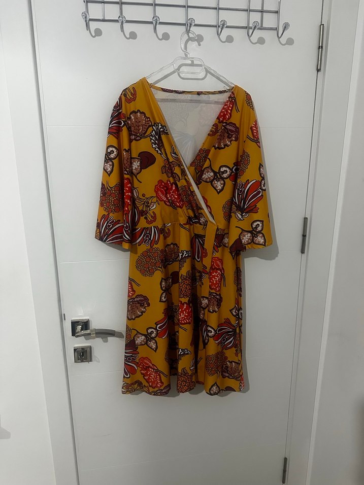 Renkli sarı bohem mini elbise, bol kesim, kısa kollu ve canlı batik desenlidir. Rahat bir stil sunar.