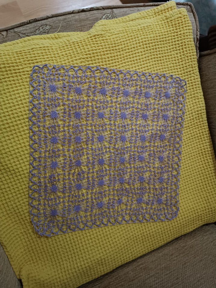 Gri nakışlı bohem desenli, dokulu sarı kumaştan kırlent kılıfı.