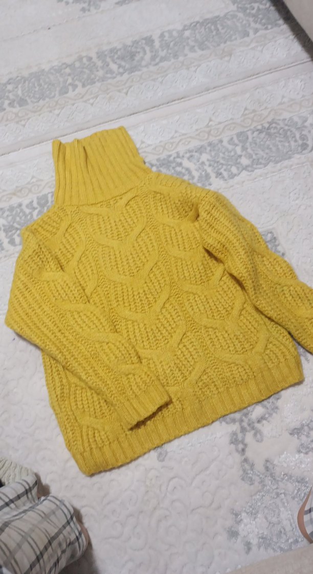 Sarı renkli, bohem tarzda örgü kadın kazak. Yumuşak dokulu, boğazlı ve uzun kollu, rahat kesime sahiptir. Günlük kullanıma uygundur.